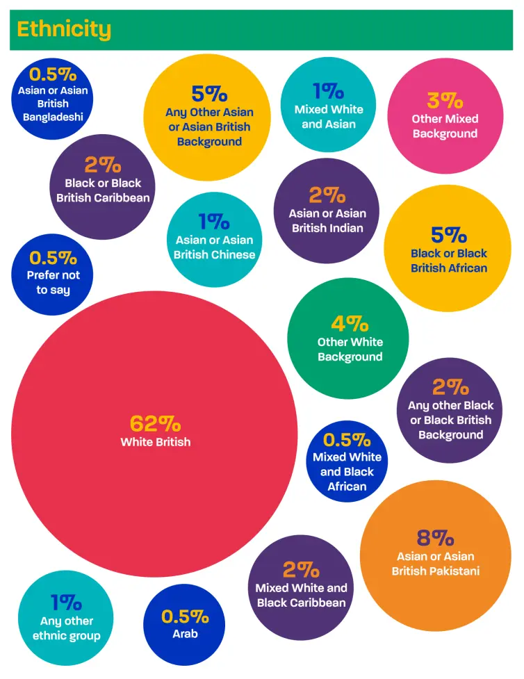 Compared to the Greater Manchester Census data, we have a lower percentage of people from White backgrounds and higher percentages of people from Asian and Asian British backgrounds, Black and Black British backgrounds, and Mixed backgrounds.